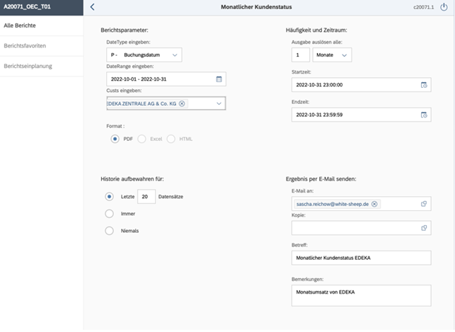 Noch komfortabler ist es, wenn Sie als Anwendende:r systemseitig automatisch informiert werden – dafür können Sie die „Berichtseinplanung“ ganz einfach konfigurieren und an Ihre Erfordernisse anpassen: Im Konfigurator können Sie alle Berichte mit einem individuellen Ausgabedatum bzw. Versandrhythmus hinterlegen. So können Sie sich z. B. monatliche oder wöchentliche Kund:innen-Berichte terminieren, um am Wochen- bzw. Monatsende automatisch über deren geschäftliche Entwicklung via E-Mail informiert zu werden. Natürlich können Sie auch mehrere E-Mail Adressen für die Aussendung des Reports hinterlegen sowie verschiedene Kund:innen in individuellen Kundengruppen zusammenfassen.