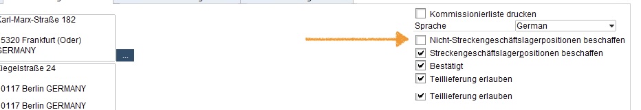 Mit dem unscheinbaren Häkchen „Nicht-Streckengeschäftslagerpositionen beschaffen“ wird die Magie aktiviert, wobei dieses standardmäßig (also bei Neuanlage eines Auftrages) deaktiviert ist, weil ja in der Regel vorrangig aus dem bestehenden Lagerbestand geliefert werden soll.